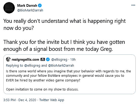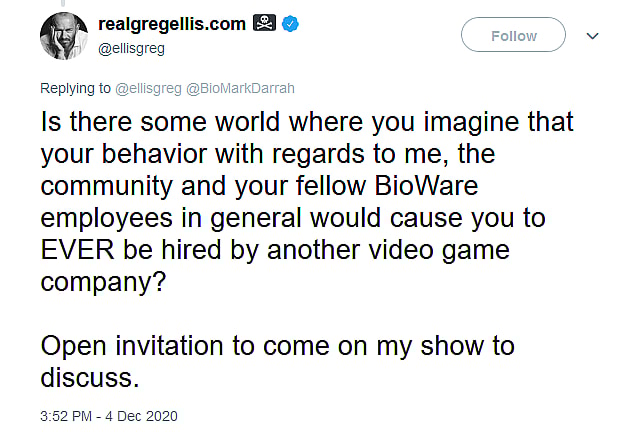 The voice actor then turned Darrah’s own rhetoric against him, asking the producer “Is there some world where you imagine that your behavior with regards to me, the community and your fellow BioWare employees in general would cause you to EVER be hired by another video game company?”
