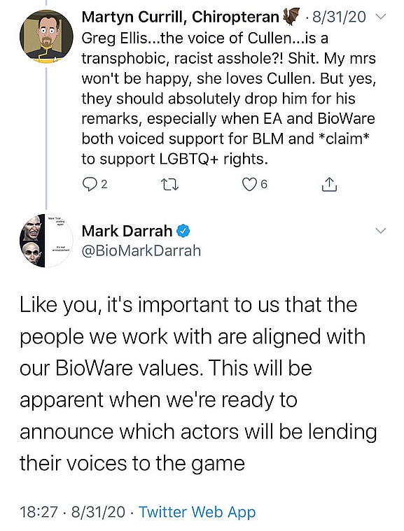 In response to a Twitter user who described Ellis as a “transphobic, racist asshole,” Darrah wrote, “Like you, it’s important to us that the people we work with are aligned with our BioWare values.”