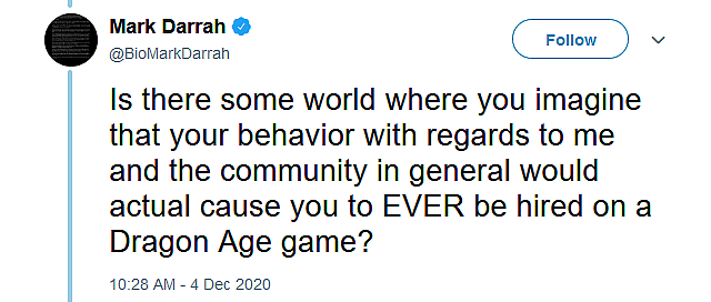 “Is there some world where you imagine that your behavior with regards to me and the community in general would actual cause you to EVER be hired on a Dragon Age game?,” asked Darrah.