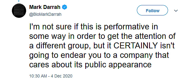 “I’m not sure if this is performative in some way in order to get the attention of a different group, but it CERTAINLY isn’t going to endear you to a company that cares about its public appearance,” Darrah added in a subsequent tweet.