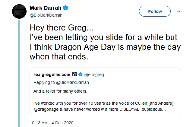 After taking notice of Ellis describing Darrah as a “DISLOYAL, duplicitous corporate fake,” Darrah told the voice actor that, I’ve been letting you slide for a while but I think Dragon Age Day is maybe the day when that ends.”