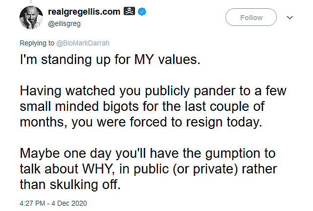 “I’m standing up for MY values,” replied Ellis. “Having watched you publicly pander to a few small minded bigots for the last couple of months, you were forced to resign today.”