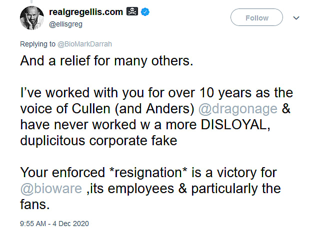 “I’ve worked with you for over 10 years as the voice of Cullen (and Anders) @dragonage & have never worked w a more DISLOYAL, duplicitous corporate fake,” exclaimed Ellis. “Your enforced *resignation* is a victory for @bioware, its employees & particularly the fans.”