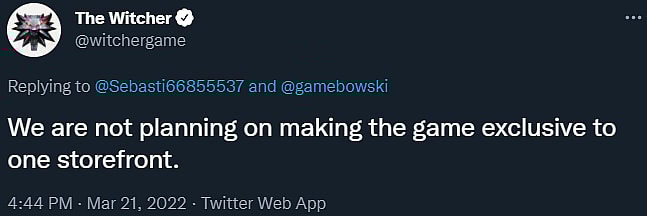 Replying to a Twitter user with exactly that fear, the official Witcher Twitter account tweeted, “We are not planning on making the game exclusive to one storefront.”