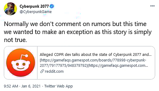 However, as the claims began to gain attention, CD Projekt Red took to the game’s official Twitter account to succinctly and definitively debunk the rumors, linking to the aforementioned /r/GamingLeaksAndRumors thread and asserting that “this story is simply not true”.