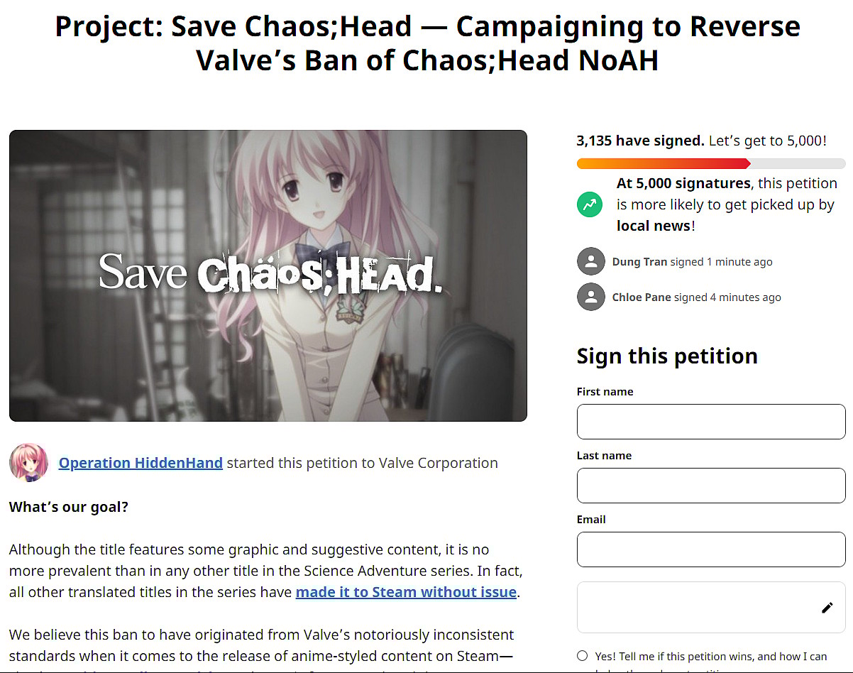 A petition was launched after the statement, calling for Valve to reverse their ban. They cite how “all other translated titles in the series have made it to Steam without issue,” and their belief the ban “originated from Valve’s notoriously inconsistent standards when it comes to the release of anime-styled content on Steam.”