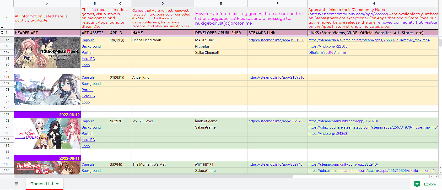 An unofficial “Steam Banned and Removed Games List” Google Doc has listed “adult games, visual novels, anime games and relevant Apps” which had been delisted, didn’t release, or removed from Steam since 2020.