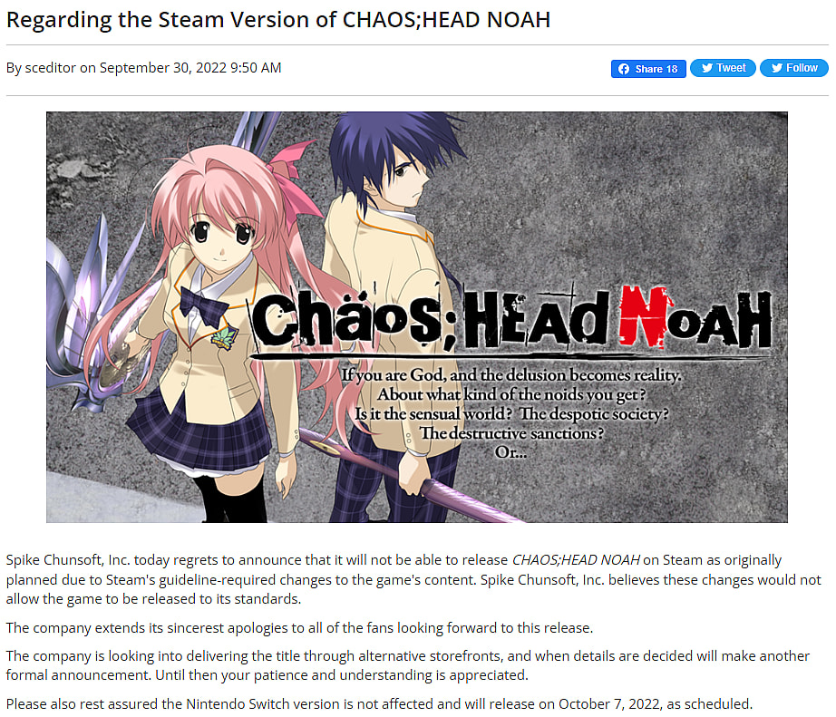 Publisher Spike Chunsoft has since issued a statement, confirming Steam had requested some form of censorship. “Spike Chunsoft, Inc. today regrets to announce that it will not be able to release CHAOS;HEAD NOAH on Steam as originally planned due to Steam’s guideline-required changes to the game’s content. Spike Chunsoft, Inc. believes these changes would not allow the game to be released to its standards.”