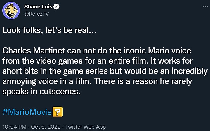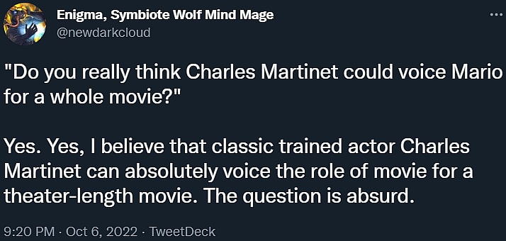 “Do you really think Charles Martinet could voice Mario for a whole movie?” @newdarkcloud rhetorically asked. “Yes. Yes, I believe that classic trained actor Charles Martinet can absolutely voice the role of movie for a theater-length movie. The question is absurd.”