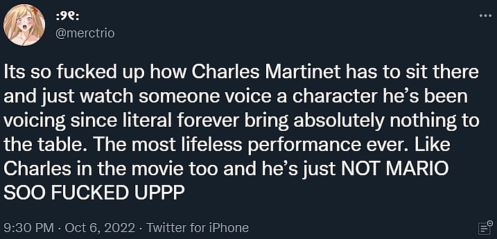 “Its so f—ked up how Charles Martinet has to sit there and just watch someone voice a character he’s been voicing since literal forever bring absolutely nothing to the table,” @merctrio lamented. “The most lifeless performance ever. Like Charles in the movie too and he’s just NOT MARIO SOO F–KED UPPP.”