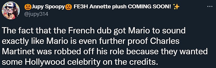 “The fact that the French dub got Mario to sound exactly like Mario is even further proof Charles Martinet was robbed off his role because they wanted some Hollywood celebrity on the credits,” @jupy314 theorized.
