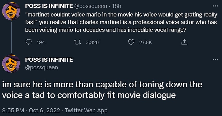 “‘Martinet couldnt [sic] voice mario in the movie his voice would get grating really fast’ you realize that charles martinet is a professional voice actor who has been voicing mario for decades and has incredible vocal range?” @possquee defended. “Im [sic] sure he is more than capable of toning down the voice a tad to comfortably fit movie dialogue.”