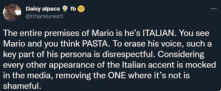 Some even argued the lack of a heavy Italian accent was more offensive. “The entire premises of Mario is he’s ITALIAN. You see Mario and you think PASTA. To erase his voice, such a key part of his persona is disrespectful,” @tthankunextt denounced. “Considering every other appearance of the Italian accent is mocked in the media, removing the ONE where it’s not is shameful.”
