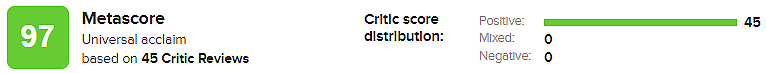 It has achieved a Metascore of 97 out of 100, based on 45 critic reviews. All 45 reviews are scored at 90 or higher.