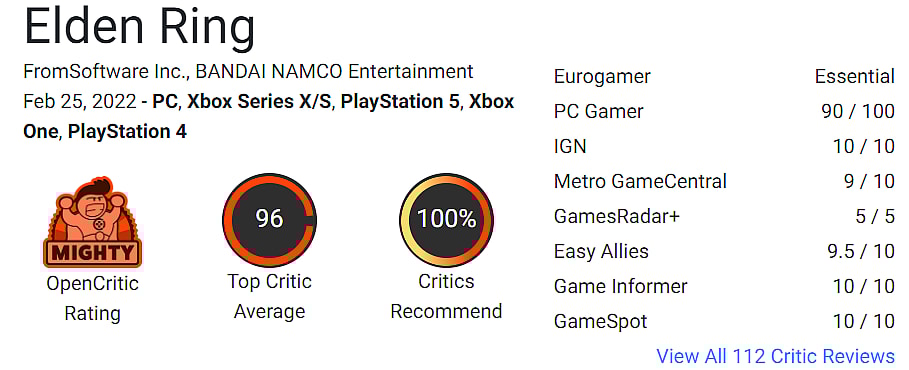 Open Critic also shows nigh-perfection among its review aggregate. The game has a 96 out of 100 on average from “top critics,” and a 100% critic recommendation across 112 reviews.