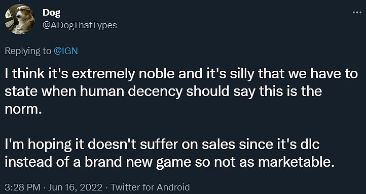 “I think it’s extremely noble and it’s silly that we have to state when human decency should say this is the norm,” upheld @ADogThatTypes. “I’m hoping it doesn’t suffer on sales since it’s dlc instead of a brand new game so not as marketable.”