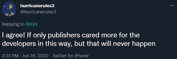 “I agree!” @hurricanerules3 tweeted before bleakly admitting, “If only publishers cared more for the developers in this way, but that will never happen.”