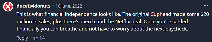 “This is what financial independence looks like,” wrote user ducets4donuts under IGN’s actual article. “The original Cuphead made some $20 million in sales, plus there’s merch and the Netflix deal. Once you’re settled financially you can breathe and not have to worry about the next paycheck.”