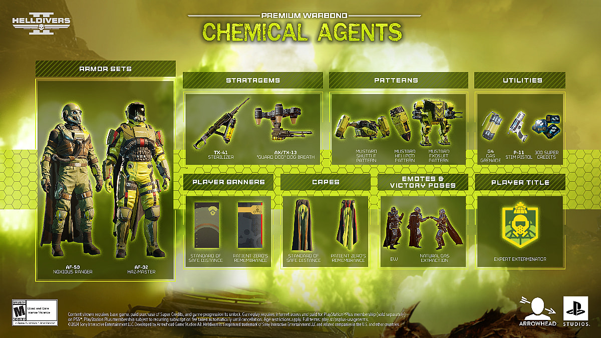 Priced at 1,000 Super Credits, for those who don’t want to spit out $10 USD to buy the required in-game currency outright, the Chemical Agents Warbond can also be unlocked through grind.