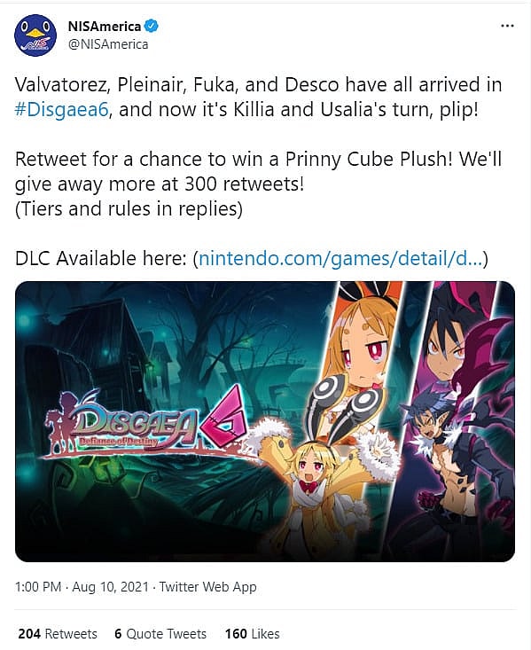 “Retweet for a chance to win a Prinny Cube Plush! We’ll give away more at 300 retweets (Tiers and rules in replies).”