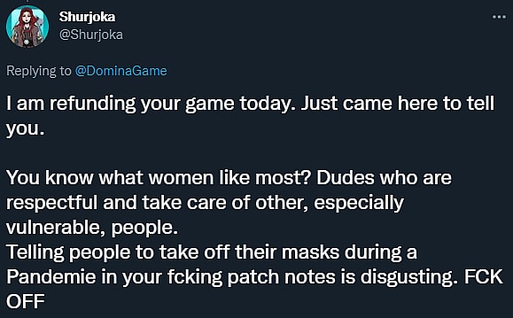 “Telling people to take off their masks during a Pandemie in your f—-g patch notes is disgusting,” @Shurjoka raged. “FCK OFF”