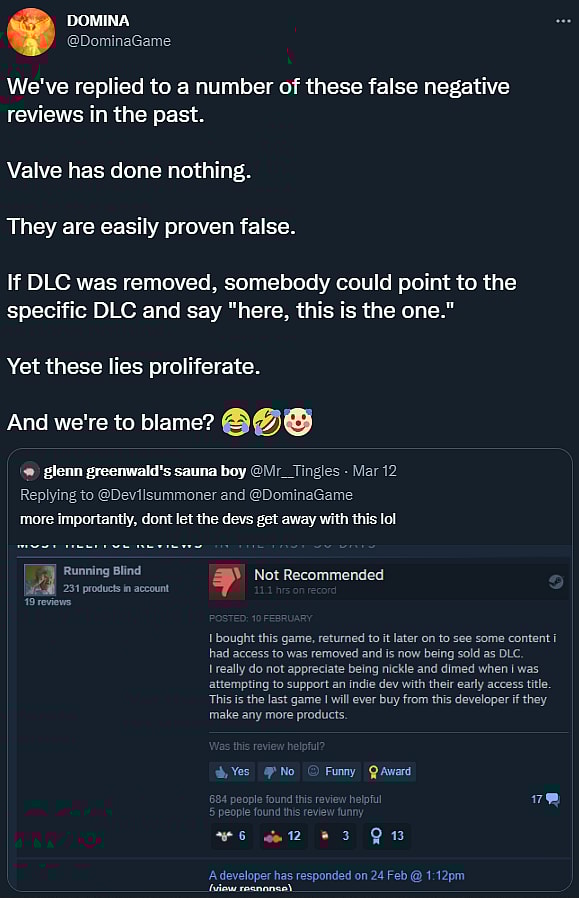 The official Domina Twitter account also addressed reviews accusing them of pulling content to turn into DLC.