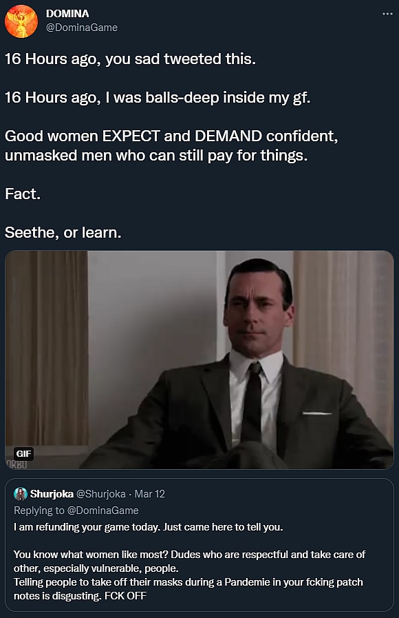“Good women EXPECT and DEMAND confident, unmasked men who can still pay for things,” the developer proclaimed, “Fact. Seethe, or learn.”