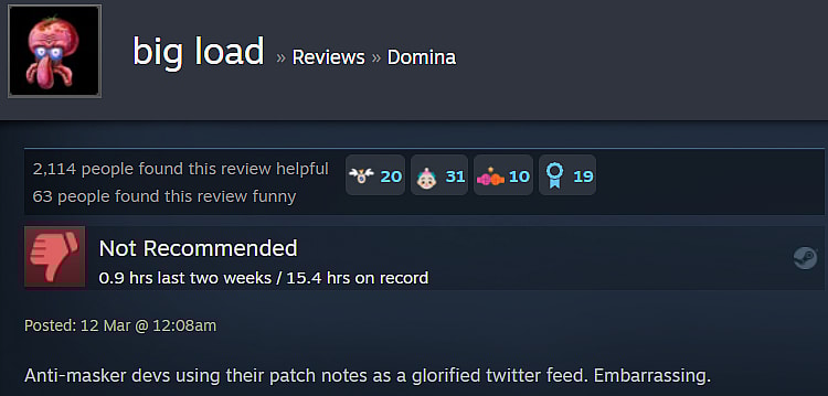 Domina Gets Review Bombed After Encouraging Players To Not Wear Masks And Avoid Pornography, Mocks Woke Mob For Attempting To Cancel Them