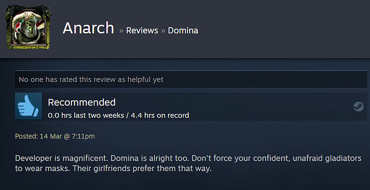 Since March 9th, there has been a dramatic increase in negative reviews for Domina. Steam has noted the 1,040 recent reviews– out of 7,977- are “Mostly Negative.” Only 244 of those recent reviews recommended the game, though some recent reviews praised the developer’s frank attitude.