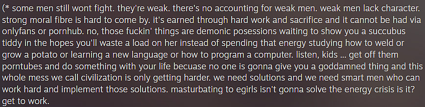 “Listen, kids … get off them porntubes and do something with your life,” the developer advised, “becuase [sic] no one is gonna give you a goddamned thing and this whole mess we call civilization is only getting harder. we need solutions and we need smart men who can work hard and implement those solutions. masturbating to egirls isn’t gonna solve the energy crisis is it? get to work.”