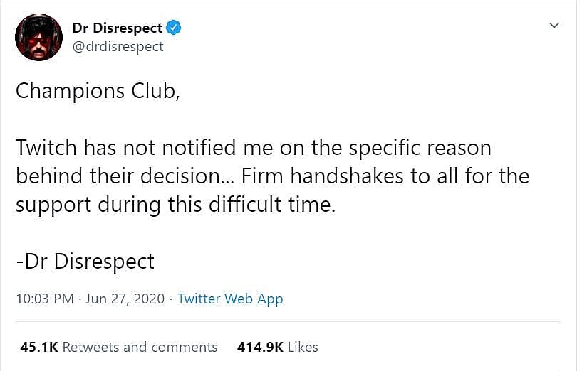 For those unfamiliar, Dr Disrespect was reportedly banned from Twitch. No reasons were forthcoming from Twitch and Dr Disrespect had not made a statement.