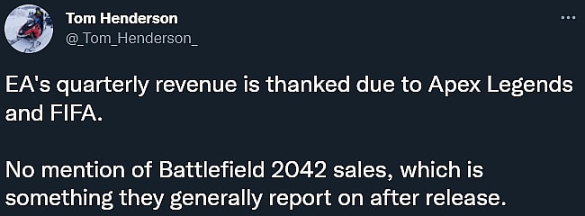 “EA’s quarterly revenue is thanked due to Apex Legends and FIFA,” he added to his continuing commentary. “No mention of Battlefield 2042 sales, which is something they generally report on after release.”