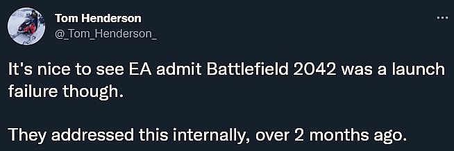Following the presentation’s conclusion, Henderson tweeted, “It’s nice to see EA admit Battlefield 2042 was a launch failure though. They addressed this internally, over 2 months ago.”
