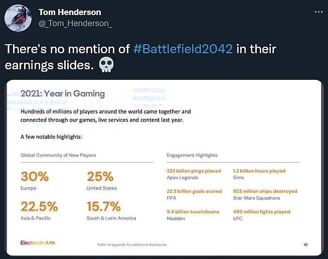 That very earnings call (as transcribed by SeekingAlpha) has since vindicated Henderson, as during its presentation, the leaker noted that “There’s no mention of #Battlefield2042 in their earnings slides.”