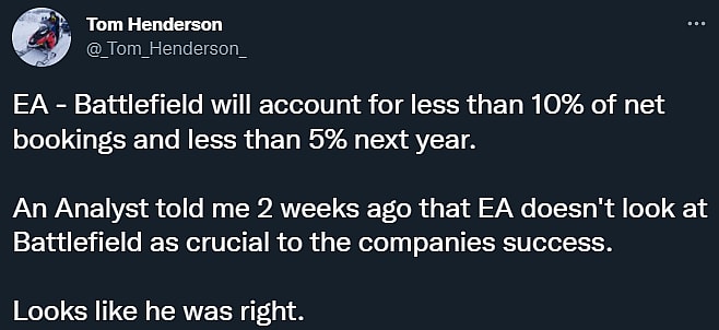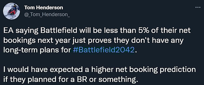 However, Henderson was ultimately concerned that the statements made by EA showed a lack of faith in the series’ future, proposing, “EA saying Battlefield will be less than 5% of their net bookings next year just proves they don’t have any long-term plans for #Battlefield2042.