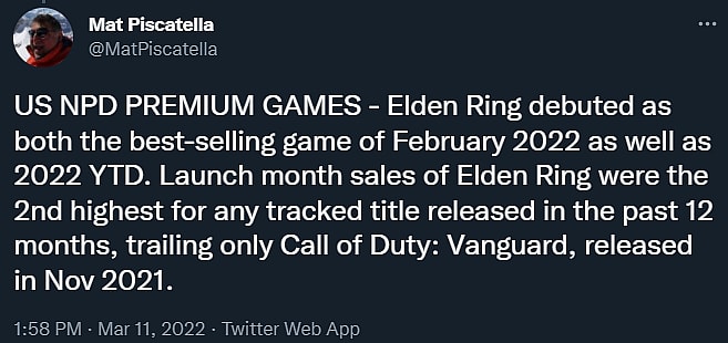 “Launch month sales of Elden Ring were the 2nd highest for any tracked title released in the past 12 months, trailing only Call of Duty: Vanguard, released in Nov 2021,” he divulged.
