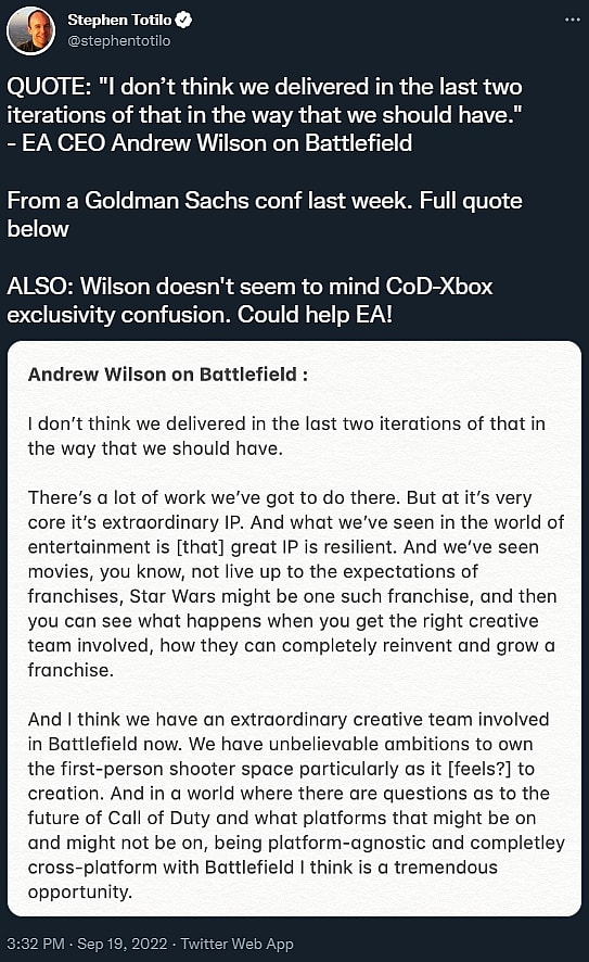 “We have unbelievable ambitions to own the first-person shooter space particularly as it [feels?] to creation. And in a world where there are questions as to the future of Call of Duty and what platforms that might be on and might not be on, being platform-agnostic and completley [sic] cross-platform with Battlefield I think is a tremendous opportunity,” Wilson justified.