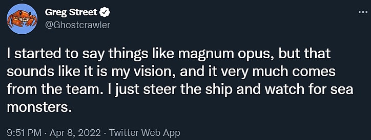 “However assuming it does,” Street placated, “this will be the fourth major franchise I have worked on (AoE [Age of Empires], WoW, LoL), and likely the last. And I am very okay with that. It will be a good final act.”