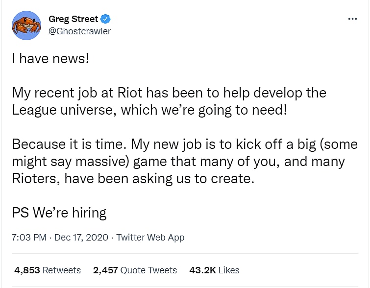 He added, “Because it is time. My new job is to kick off a big (some might say massive) game that many of you, and many Rioters, have been asking us to create. PS We’re hiring.”