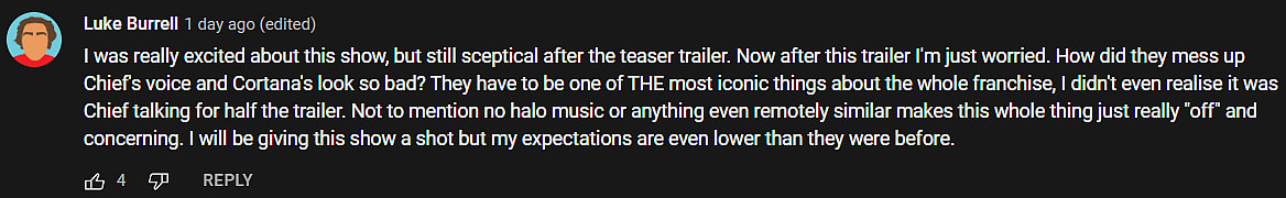 One YouTuber user, Luke Burrell, commented “I was really excited about this show, but still sceptical after the teaser trailer. Now after this trailer I’m just worried. How did they mess up Chief’s voice and Cortana’s look so bad?”