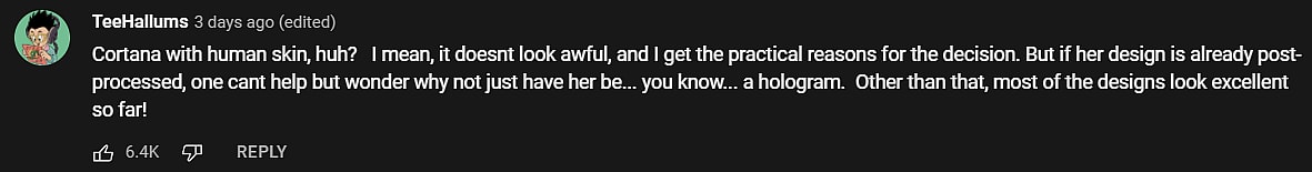 “Cortana with human skin, huh?” another user, TeeHallums, mused. “I mean, it doesnt look awful, and I get the practical reasons for the decision. But if her design is already post-processed, one cant help but wonder why not just have her be… you know… a hologram. Other than that, most of the designs look excellent so far!”