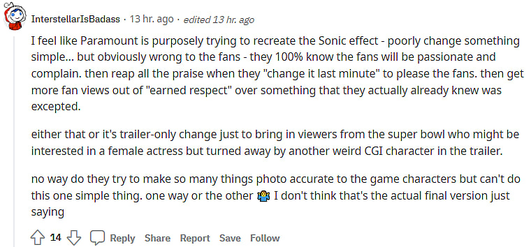 Continuing, they speculated, “Then [they will] get more fan views out of ‘earned respect’ over something that they actually already knew was excepted. Either that or it’s trailer-only change just to bring in viewers from the super bowl who might be interested in a female actress but turned away by another weird CGI character in the trailer.”