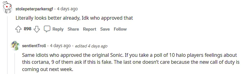 With around 3,000 upvotes each, fans reacted positively to these edits, with comparisons being quickly drawn to the debut trailer for the Sonic the Hedgehog movie, such as /u/SentientTroll proposal that the same people who approved Cortana’s appearance were the “same idiots who approved the original Sonic.”
