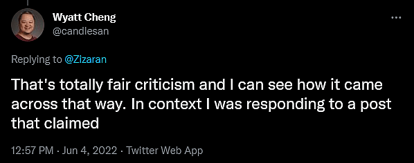 “That’s totally fair criticism and I can see how it came across that way,” admitted Cheng.