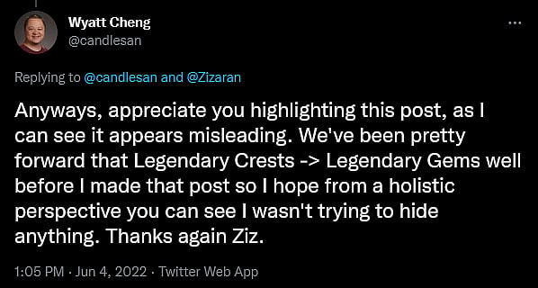 “Anyways, appreciate you highlighting this post, as I can see it appears misleading,” the designer concluded. “We’ve been pretty forward that Legendary Crests -> Legendary Gems well before I made that post so I hope from a holistic perspective you can see I wasn’t trying to hide anything. Thanks again Ziz.”