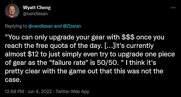 “In context I was responding to a post that claimed, ‘You can only upgrade your gear with $$$ once you reach the free quota of the day. […]it’s currently almost $12 to just simply even try to upgrade one piece of gear as the ‘failure rate’ is 50/50′,” he continued. “I think it’s pretty clear with the game out that this was not the case.”