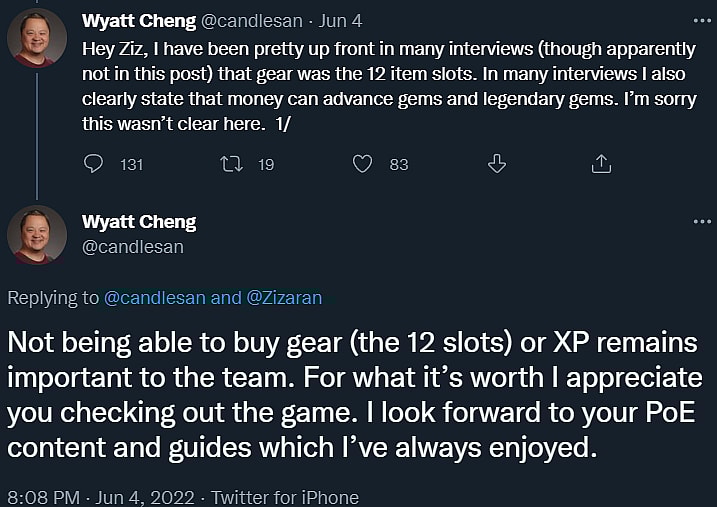 “In many interviews I also clearly state that money can advance gems and legendary gems,” he clarified. ” I’m sorry this wasn’t clear here. Not being able to buy gear (the 12 slots) or XP remains important to the team.”
