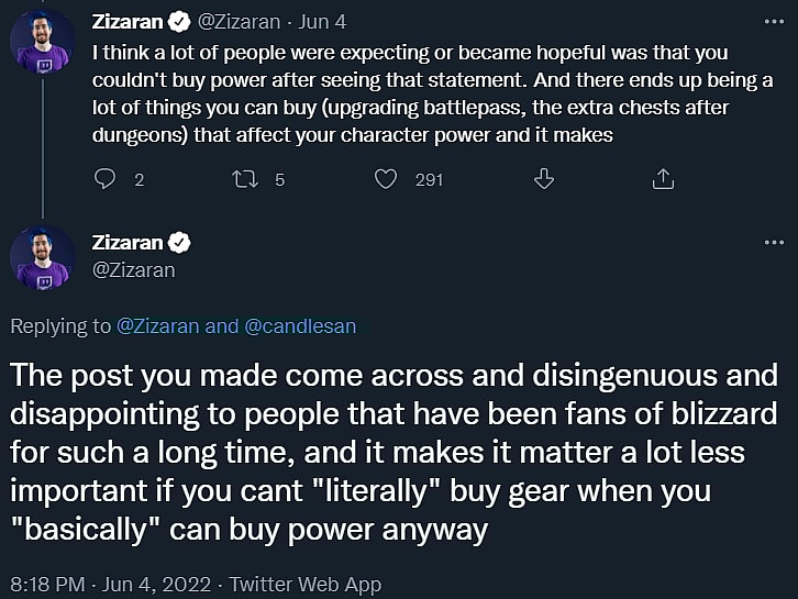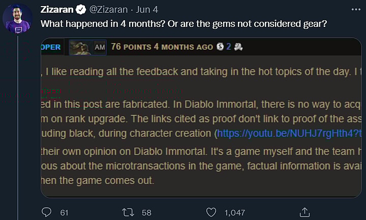 “The post you made come across and disingenuous and disappointing to people that have been fans of blizzard for such a long time, and it makes it matter a lot less important if you cant ‘literally’ buy gear when you ‘basically can buy power anyway,” the YouTuber condemned.