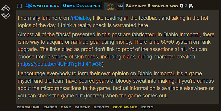 Similarly frustrated with the game’s microtransactions, YouTuber Zizaran pointed to a January 2022 Reddit comment from Lead Game Designer Wyatt Cheng – the man who infamously criticized fan disappointment at Diablo Immortal’s reveal by condescendingly asking “Do you guys not have phones?” – to highlight the developers’ dishonesty.