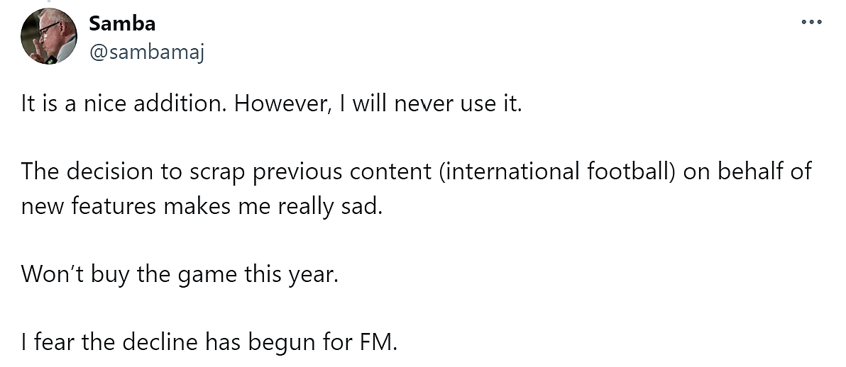 This feeling was perhaps best summarized by Twitter user @sambamaj, who opined “It is a nice addition. However, I will never use it. The decision to scrap previous content (international football) on behalf of new features makes me really sad. Won’t buy the game this year. I fear the decline has begun for FM.”